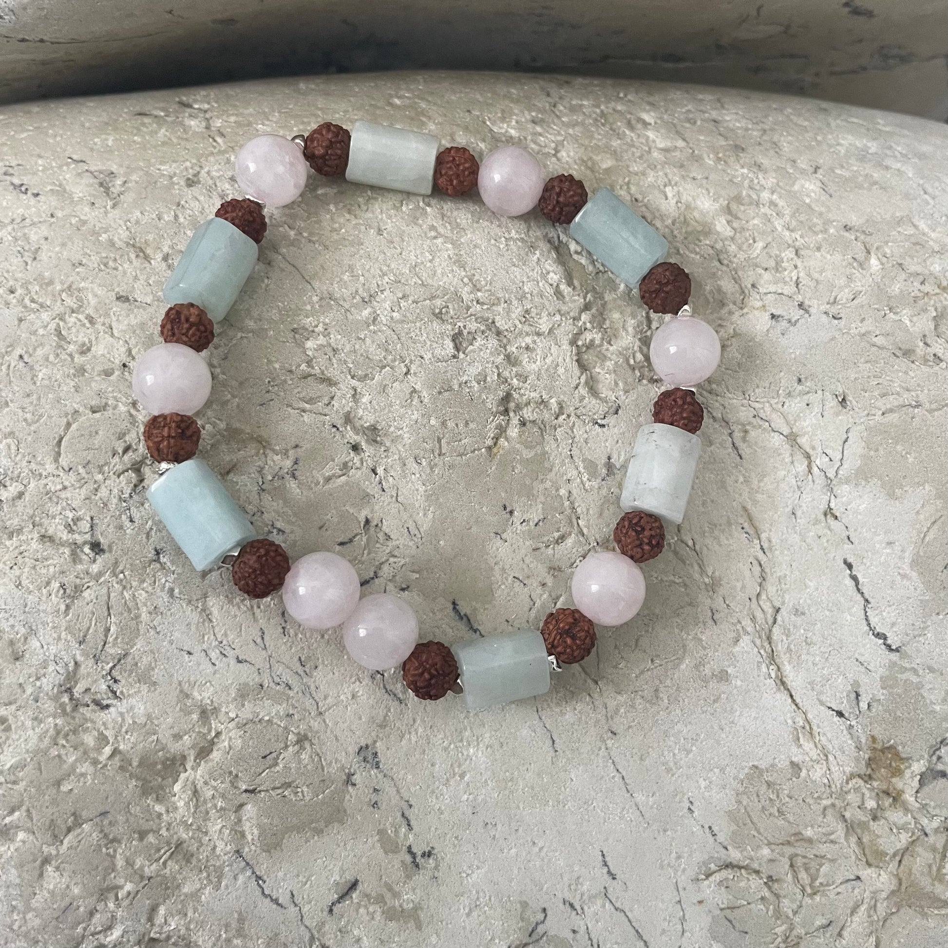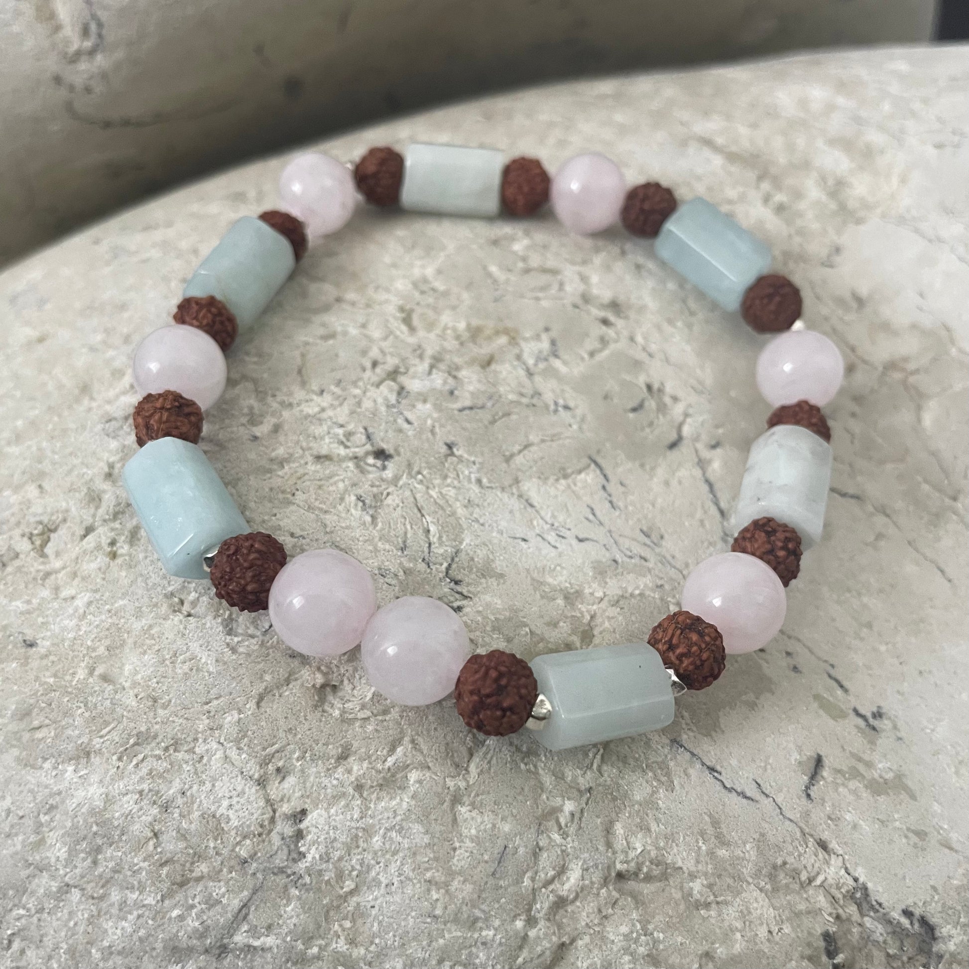 Handcrafted with intention and care, this stretch bracelet marries Rose Quartz, Aquamarine, Rudraksha, 925 silver spacers on a durable elastic core. Only one available.