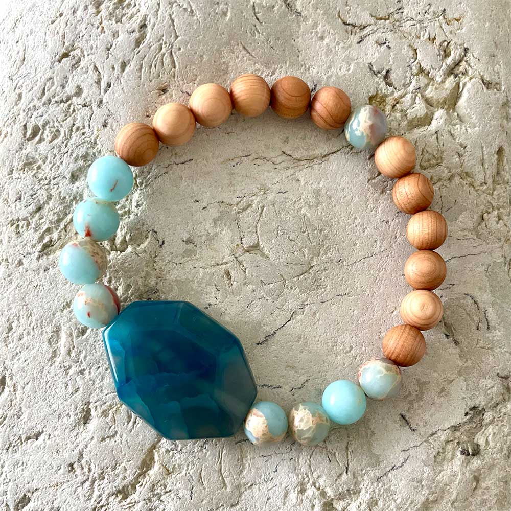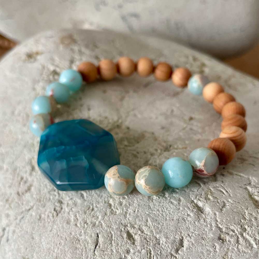 Handcrafted with intention and care, this bracelet pairs buttery 8 mm Shoushan Stone rounds and warm 8 mm Sandalwood beads with a faceted Blue Agate octagon focal and sterling-silver spacer accents on a durable stretch cord (≈ 17 cm slip-on). Only one available.